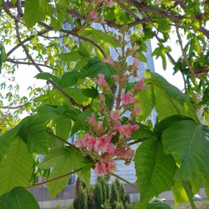 花友さんと中之島美術館から、🚶🏼🚶🏼♀️梅田までブラブラ〜 高層ビル街の街路樹に可愛い🌺花が〜 ベニバナトチノキ(トチノキ科) もう少ししたら キレイな並木道に〜🌺🌳🌺🌳