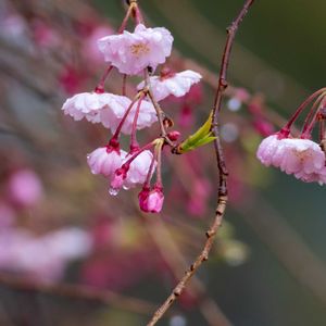 冷たい雨のなか、ヤエベニシダレザクラが雨粒をまとっていました。2025.04.03.