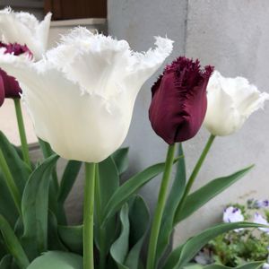 ブラックのフリンジ八重咲きのチューリップが色付き始めました❣️昨年掘り上げた球根が開花してくれました♪ ラベルエポックと同じ鉢に仕込んだのだけどギリギリコラボ😊 右下のトングの先みたいなのはブラックパーロットなのですが、もう少し時間がかかりそう…