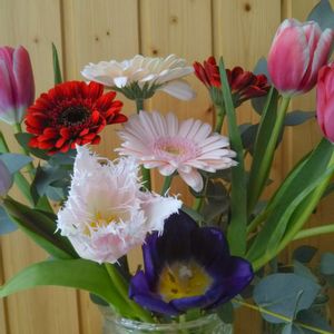 かわいいなぁ😍フリンジ咲きチューリップ🌷 ガーベラとチューリップ、ユーカリのアレンジです🎵