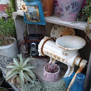 お気に入りコーナー🍀 3つのアイテム 増えました⸜(*´꒳`*)⸝ 答えはPIC2️⃣ですෆ˚* 🍀レトロなカメラ 🍀キセログラフィカ 🍀ウスネオイデス アンティークなもの お気に入りに出逢うって ほぼ皆無だけど うちの庭に素敵グッズ 届けてくださいました🎁❤️🚚💖 ̖́- おかげで汚庭が 。:.゚おぉ(*゚O゚ *)ぉぉ庭゚.:。+゚ 素敵コーナー充実です🤗❤️ 私の庭のコーディネーターに なってるかも😂 感謝の🎁❤️でした🙏 3️⃣4️⃣I love はちゅの日🦎 カメラオンヘッドの 頭可愛いピンクの葉っぱ 発見👀💕 明日から雨続きですෆ˚* 約1週間☂️マーク😅 今日は朝から家庭菜園に じゃがいも🥔植えたけど 吉と出るか凶と出るか 運試しです(´×ω×`)