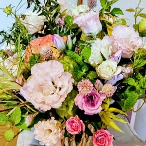 お彼岸に姉に送ったアレンジ❁⃘*.゚ 写真を送り返してくれました( ¯﹀¯ ) 一枚目が横から撮った様子 二枚目が正面 仏壇にではなく玄関に飾ってもらうお花です💕