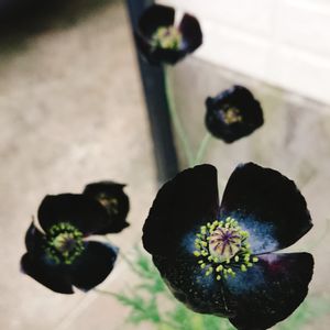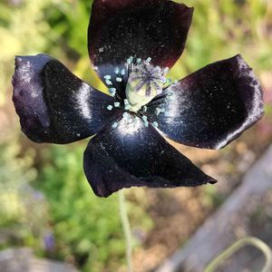庭に咲いた小さな小さな真っ黒黒ケシ 繊細な茎と花弁が雨に打たれていたので連れてきました 本当に真っ黒🖤 今日は摘んでしまったけど こぼれ種で増えるといいなぁ