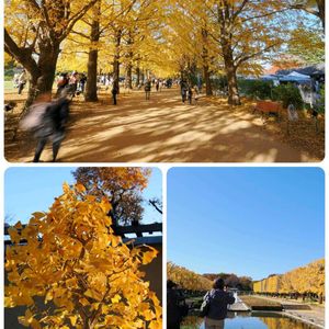 昨日の昭和記念公園のイチョウ もう見ごろ終盤でした 上は、かたらいのイチョウ並木 左下は、日本庭園盆栽園のイチョウの盆栽 右下は、カナールのイチョウ並木 🏷️日曜ビタミンカラー♪