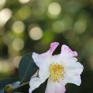 今日のお花 サザンカ🌿 (山茶花) 花びらの縁が 可愛いピンクです🫧🎶 わが家のサザンカで 1番初めに 咲き始めます *ツバキ科 *ツバキ属