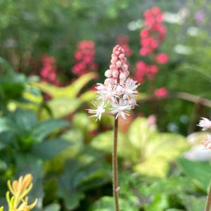 ティアレアの花が咲きました 植え付けて3ヶ月ほどで、小さな葉っぱなのに花がたくさん咲いています♪ ヒューケラより豪華な花なんですね♪