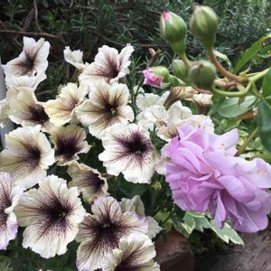 ✨✨フロックス モントローザトリカラー✨✨ 去年より花数も増えました🎶 斑入り葉が 優しい花色と似合います💖 大好きな ペチュニアカプチーノとコラボ💕 バックには シルバーリーフのサントリナ🎶