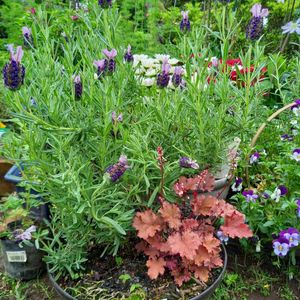 1年前に小さな苗を4種入れた寄せ植え🌱 ❀フレンチラベンダー❀と❁ヒューケラ❁が 冬越しして♡ʾʾ花が咲いてくれました💜💕