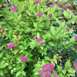 黄金シモツケ 濃いピンクの花と、斑入りの葉のコントラストがきれい 花の束が小さくて可愛い