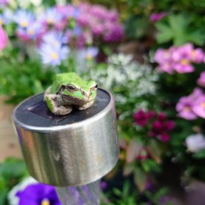 番外編です❗ 我が家に住み着いている ニホンアマガエルでソーラーライトの上で充電しているように見えます😅🤭 警戒心が無くレンズを近くに向けても 逃げようとしません😃 苦手な方ごめんなさいm(_ _;)m