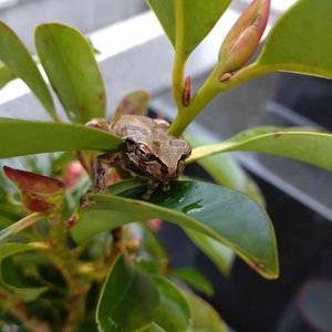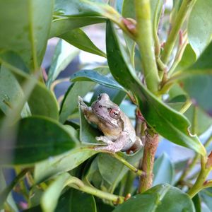 お墓掃除に行ったら、花立てのサカキの陰に、まだアマガエル🐸がいた😅 この子は一体いつになったら冬眠するんだろう???🤔