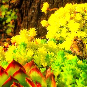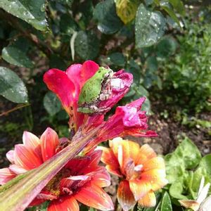 ☘️お花の中からアマガエル君🐸 寄せ植えのお花の中に🐸君がいます。 今朝、去年のように亀の餌をピンセットであげてみました。 ぜんぜん口を開けようとしないし、最後には飛んで逃げてしまいました。 やっぱりそらまめではないですね😢