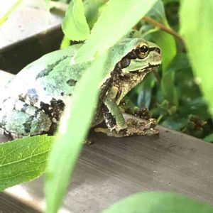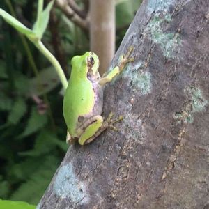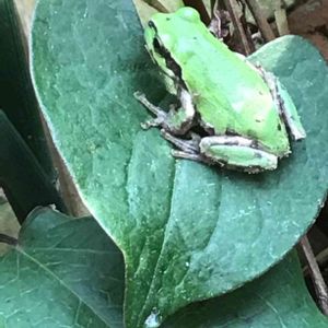 今日はお庭に可愛いお客さんが遊びに来てくれました。❤︎ お声を聞いた事はあったけど、御姿を見たのは初めてですぞ。この子がいるってことは環境が良い証拠らしいので、とっても嬉しいわ! 体色が同化してるけど、わかるかなー。🐸