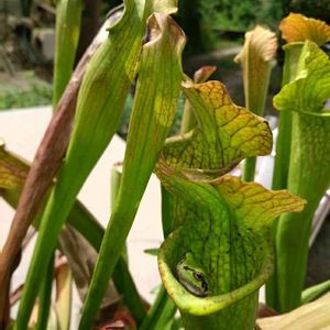 台風の片付け中。 サラセニアは台風でもそのまま放置でした。 鉢が倒れたり、茎が折れたりも多少ありましたが、どのみち冬に枯れますから気にしない😄 アマガエルはまだ避難中のようです😊