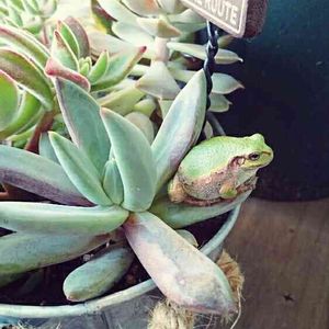 おはようございます⛅🙋 我が家の玄関先に住み着いてるカエルちゃんです🐸 睡蓮鉢もあるしお休み処も多肉の陰…葉っぱの上だ❗居心地良さそう😌