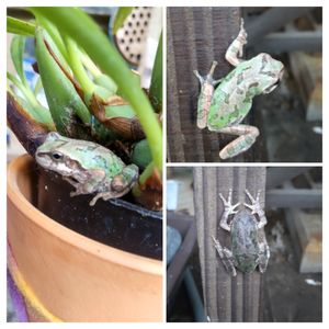 アマガエルちゃん🐸 マンゴーに西日ががっつり当たってきたので マキシラリアに移動してました。 そして柱に移動。 保護色になってますね。 同じ子ですよ☺️ 緑の時は判らないけど 個体ごとに模様が違うんです。