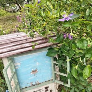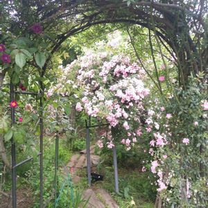バーゴラに咲くヒマラヤンムスクの挿し木とクレマチス。バーゴラには3種類の薔薇たちが咲いています。 届かないので放置栽培。