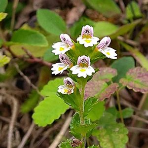 ✲ ツクシコゴメグサ ✲ 白い小さな花を米粒に見立てた所から「筑紫小米草」と名前がついたそうです。 8ミリ位と小さく下唇の黄色い斑点が特徴です。 とても愛らしい花ですね♡ コゴメグサの仲間は多いですがこちらでは葉っぱがトゲトゲしい感じで鋸歯の先が尖ったキュウシュウコゴメグサも見られます(*˘︶˘*).。*♡ 絶滅危惧1B類