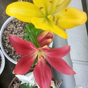 白い透かしユリとピンクの透かしユリはほぼ散りましたが、入れ替わりに、黄色と赤の透かしユリが綺麗に咲きました🥰🥰🥰