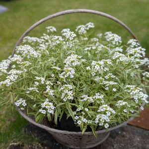 PW スーパーアリッサム フロスティナイト 挿し芽っ子です🌱 7月27日にブリキのプランターカバーに入れた株が育ってくれました🤗 今日は、ワイヤーのかごに入れてパシャリ📸