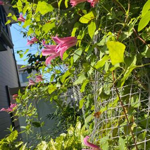 クレマチス『プリンセスダイアナ』 山茶花に絡ませてみよう!と 多分地植えして5年くらい...︎𖤣𖥧𖥣𖡡𖥧𖤣𖥧𖥣𖡡𖥧𖤣 あまり知識もない頃に植えたので そんなに掘ってなかったけど 今、20くらいニョロニョロ(~˘▾˘)~と 伸びてます💧 麻紐では追いつかないので 勝手に伸びてもらおうと 金網フェンスを巻き絡ませてます( ̄▽ ̄;) 今年も沢山咲きそうですね♡