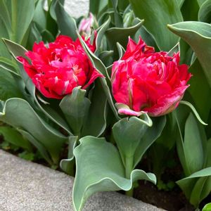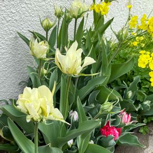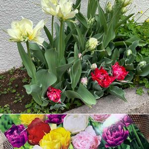 ラベルとの違いに困惑🤭ぷぷ 紅白になってしまいました💦 八重咲き混合チューリップ 開花時期は4月下旬から5月上旬と記載 白の奥に出ててる蕾も手前の赤と似ています それぞれは良いのですが色々とバランスが悪くて😅あらら
