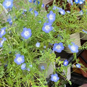 おはようございます😃 横浜はいい天気です☀️ 種まきしてから大事に育てたネモフィラ。たくさん咲いてくれているのですが、なんでこんなに暴れん坊なのかな😂茎が長い、あちこち向く、下にダラーンと垂れ下がる💦😆 折れちゃいそうなので、紐で一部ぶら下げてます😂 ここまで咲くのにすごく大変だったから、折れて欲しくない‼️😮💨 まあね、可愛いからついつい過保護なのかもしれないけど😅