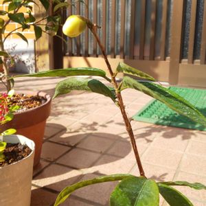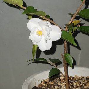 サザンカ(丁字車) 一番てっぺんの蕾が花開きました❗️ まだまだ苗状態の小ささだけど、すくすく育ってほしいです😙