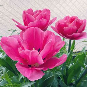 八重咲きチューリップ三兄弟🌷🌷🌷 少し遅れて咲き始めました🌷 ふわっとして可愛いな〜 でもお願い🙏それぐらいでいいよ✨ あんまり開いたら花びらが取れそうで…💦