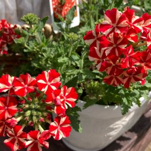 バーベナ 一昨年挿し芽から育って2年目の春を迎えました🌸まん丸に咲いてかわいいです💕 🏷真っ赤な火曜日 古くなった鉢を塗り替えてみたので、鉢も顔出しOK❣️
