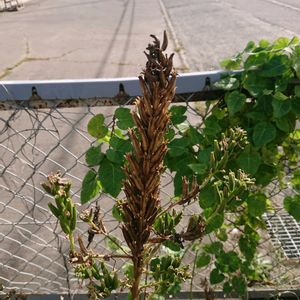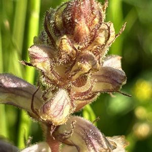 職場に忽然と顕れた あれ、これなんだったかな〰️ ツチアケビ? →花序の形がちがう オニノヤガラ?→花の形が違うような… どうやら帰化植物のヤセウツボのようです