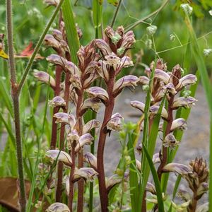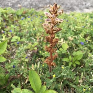 痩靫(ヤセウツボ) ハマウツボ科ハマウツボ属 寄生植物 外来種 葉緑素を持たない 西の花友さんが見た事がない、とのこと。 午前中の散歩で撮り集めてみました。 シロツメクサやムラサキツメクサに寄生 今日はコメツブツメクサに寄生(4枚目)しているのを発見。 1枚目は芽が出て来たところ、この時点ではまぁ、なんとか人目を引く姿。 野鳥公園、団地の中、どこにでもニョキニョキ出てきます。 すくすく伸び、枯れると黒茶色になり、お世辞にも綺麗とは言えない