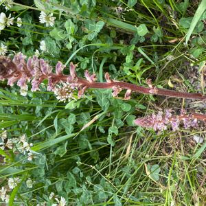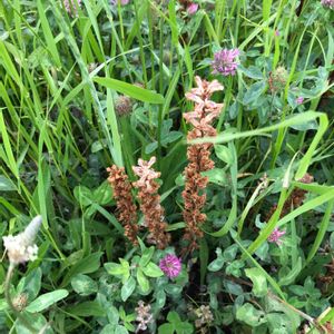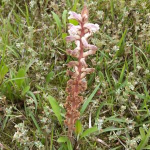 ヤセウツボ 地中海沿岸原産の寄生植物 牧草を輸入した時に付いてきたので、非意図的侵入の要注意外来生物というのだそうです アカツメクサに寄生して咲いていました