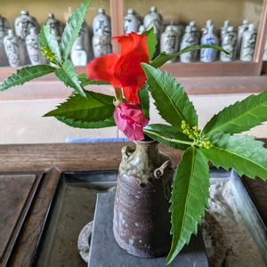 こんにちは☀☀☀🌤️☀ 1週間ぶりです ご無沙汰してました 今日は三河地方も暑いです 先日、西尾市の「無の里」に 行ってきました。 赤い花は、鳳仙花❓️ 緑の🌿は、千両ですね 此処に来ると田舎を (座敷、縁側、格子戸、厨子) 思い出します