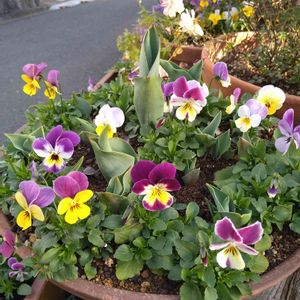 🍀ビオラ・チューリップ🍀 3月19日に投稿したダブルデッカーの写真と同じ位置から📱撮りました。 今年1月に入ってから植えたので チューリップのほとんどがいじけています。😅😭💦 おまけにパステルカラーのはずが 赤🔴白⚪黄色🟡が咲いてしまった。😭😭😭 種まきビオラはもりもり育っています。🎶🎵