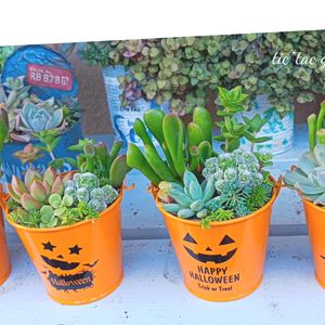 セリアのハロウィン缶に寄せ植え作りました🎃 棚が一気にHalloweenモード👻