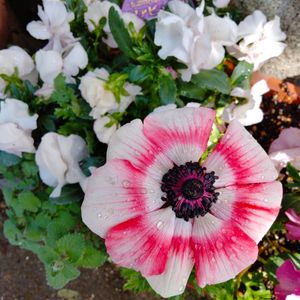 アネモネ バイカラーレッド 可愛い♥♥と思ってカメラの準備。何か花の中にいるみたい・・何だろうと思い、花の中を覗いたらアオムシ君!逆さにして振ったら飛んだ!飛んだ先は・・私の靴の上に着地⚠️ ∑ヾ(;゚□゚)ノギャアアーー!!と思わず叫んでしまった私! 良かった誰もいなくて。 (〃艸〃)恥ずかし〜
