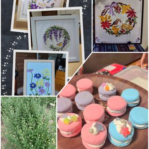 おはようございます😊 朝から連投失礼します💦 今日は庭仕事は無理なので、買い物以外はまったりとお家時間を…💕 朝の庭パトは、女帝さまのやりかけた仕事の見回りも兼ねています👀💦 雨☔なのに、昨日から干してある女帝さまの靴下を取り込んだり…💦 (何故か窓のサッシに干してある??) 外で茹でたらしい南蛮の葉🌿を棄てろ!と助言したり…😂 女帝さまはよく動くけど、私に言わせると、ほとんどが暇つぶし…😂 私は粛々と自分時間を…💓 Googleフォトから、過去に作った刺繍作品のコラージュが届いたので、時間が出来たらまたやりたいと思います⤴️⤴️ 右下↘picは、娘作のマカロン💓 食べられるのかと聞いたら、粘土で作ったもので、何かのイベントで使う試作品らしいです😆👌 女帝さまなら、きっと見たら間違えて食べるわね🤣💦