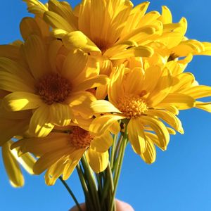 おはようございます☀️ 元気カラーな💛 ユリオプスデージー パープル💜 オカタンサスブルーキャッツアイ 出遅れたけど😅 咲きましたよ✨😆 12月もよろしくお願いします🙏 元気な楽しい カラ元気かぁ🤔 1週間になります様に☆。.:*・゜