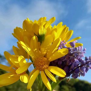朝摘みしたユリオプスデイジーとムスカリを会社で生けました😊 これから会社フラワーでアレンジメントしてみようかなぁ☺️💐