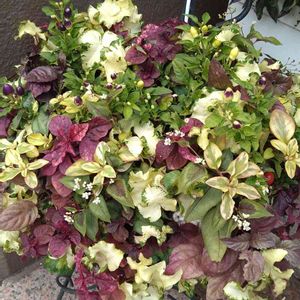 雲間草のウォールバスケット、まだまだこれから花がモリモリしてくるはず〜 しかし中々の密集ぶりで中に入れ込むのが難しかった〜 他に斑入りのストロベリーの葉もアクセントです