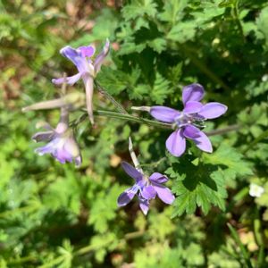 道端で見つけたかわいい😍お花 花の大きさはスミレぐらいです がんばって調べたらセリバヒエンソウ/芹葉飛燕草でしたー❣️ 小さなオダマキみたいで可愛いけど有毒💦