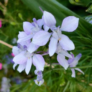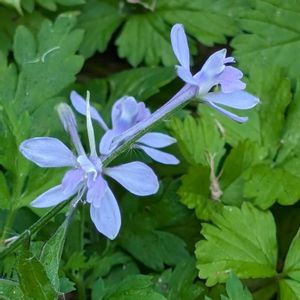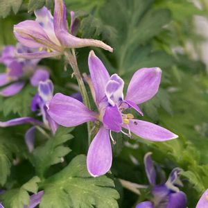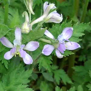 花💠の形がツバメが飛ぶ姿のヒエンソウに似ています。 葉は切れ込みが多くセリに似ている。 青紫色の💠何とも涼しそう
