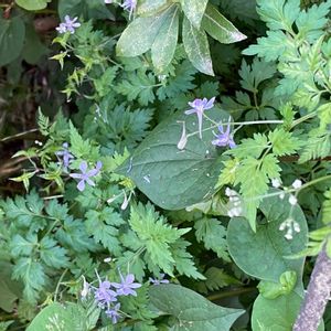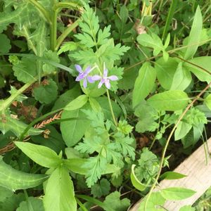 花弁が5枚。葉が特徴的です。 日陰だったり、ひなたにも咲いてました。 セリバヒエンソウ🌸🌿 芹葉飛燕草 かたかごさん、ジュリアーノさんに教えて頂きました~ 花弁に見えるところは、萼です。後ろに距が飛び出てます。