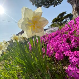 うつむきかけた〜🎶水仙を撮るために芝桜に寝転んで🌸 昨日の我が家の庭です🏡 今どき水仙と芝桜なのです。 ウコン桜はやっと咲き始めました🌸 それにしても雑草は元気だな💦 芝桜の隙間からピョンピョンとイネ科の植物が🌱 また戦いの火蓋が切って落とされました🪖⚔