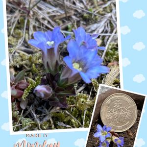 我が家の庭。雑草混じりの通路に 小さい小さいリンドウが咲いていました🎶 踏んづけてやる❗️ってならないように、渋めの山野草鉢に植えてみた🎶 はて、このリンドウは? ハルリンドウですか? フデリンドウですか? それとも別のリンドウですか? お詳しい方、お願いします🙏 大きさ比較のため、五百円玉をset✌️ ちっさいのがお分かりいただけますか? エンドウさん、こんなん出ました〜🎶 朝起きたら101号ホームラン⚾️が出ていた😆 良い一日です🎶 シダ好き爺さんとエンドウさんのおかげで、フデリンドウと分かりました🎶 納得‼️