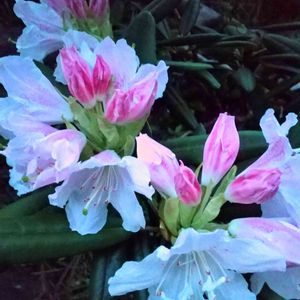 おはようございます☺️ 暖かさ誘われて…先日蕾をupした うちの☘️シャクナゲ☘️も開花しています😉 あっと言う間に満開ですので… 最近の🌧️続きの天気が気になります😚 夕方撮影のため…暗闇に浮かび上がった感じになっちゃいました😅
