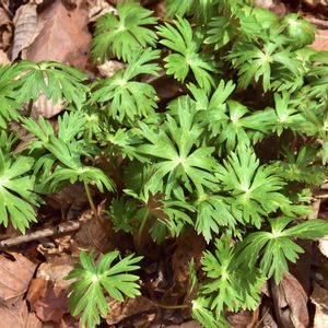 日光植物園(4/1 開園日) 湿った枯れ葉の中にこの🌿がそこかしこに。 これ「ヤマトリカブト」の🌿ですね。形はニリンソウにそっくり。ニリンソウも斑が薄い🌿もあるし、タチの悪いことに似たような場所に生え時に混生するんですよね😓 これを見るとニリンソウと間違って採取ないし混じっていて誤食中毒事故が後を立たないというのも宜なるかなと思うけど、頻発してるんだから、口に入れるならそこは細心の注意⚠️を払いなさいな❗️と言いたいですね💦😠