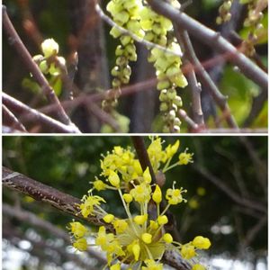 おはようございます ↑ キブシ ↓サンシュユ 散歩道で 3月14日 今年も公園の片隅でひっそりと咲いていました。