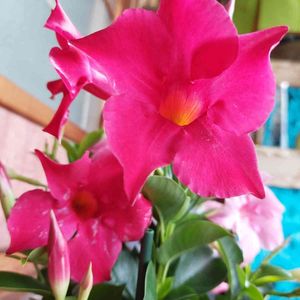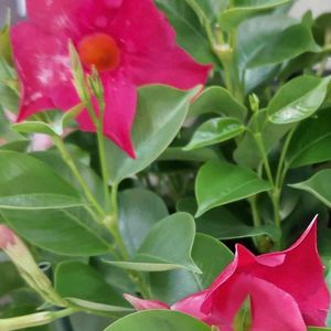 こんばんは😊 マンデヒラ リップギャルのピンク色をお迎えしていて、何回か開花しています💕 すっかり投稿し忘れている間に風船かずらに囲まれてしまいました😁 赤のレッド5は蔓が出なかったけれど、ピンクは蔓を伸ばしています‥何が違うんだろう⁉️ 同じシリーズなのに、とても不思議です🤔